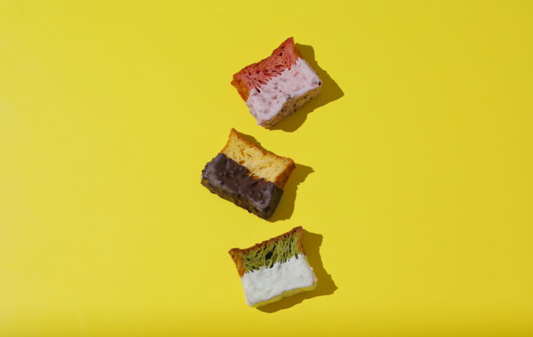 半解凍でアイスのように食べても、解凍して冷たいままでとっても美味しい、カラフルでかわいい10種のフレーバーで楽しむ小さいフレンチトースト!